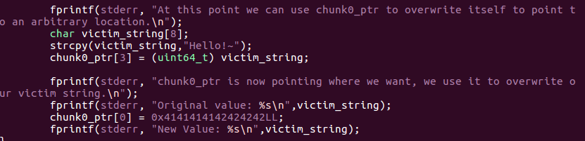 따라서 chunk0_ptr에 fd로 설정한 주소(&전역변수 + 0x18) 값, 전역변수[3] 이 들어간다.