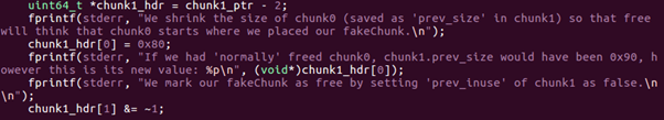fakeChunk 내 현재 chunk size 가지는 곳은 chunk0_ptr[1]이고, 이 값과 next_chunk(여기서 chunk1_ptr, 현재 chunk 주소 + size) 값이 같아야 한다.