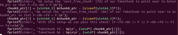 unlink 취약점을 이용해 unlink 매크로를 호출해서 fakeChunk와 free된 chunk1을 병합하기 위해 fakeChunk를 만든다.