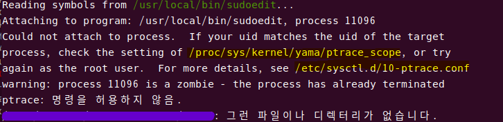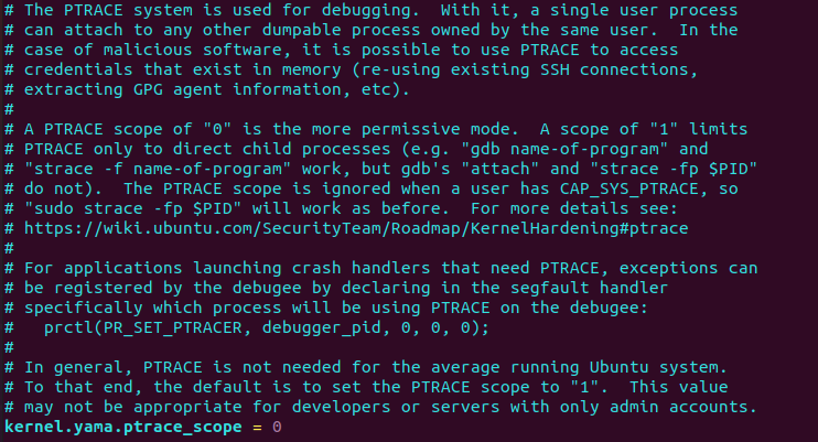 시스템 재시작 후에도 설정이 유효하도록 하려면 /etc/sysctl.d/10-ptrace.conf 파일에서 kernel.yama.ptrace_scope=0으로 설정하면 된다.