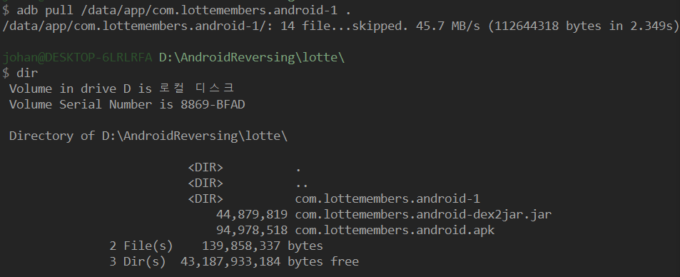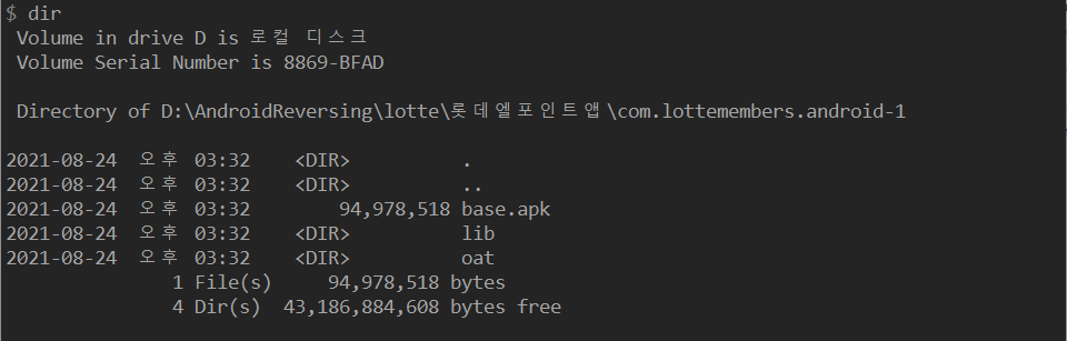 따라서 adb pull을 사용하여 해당 폴더 또는 base.apk 파일을 추출할 수 있다.
