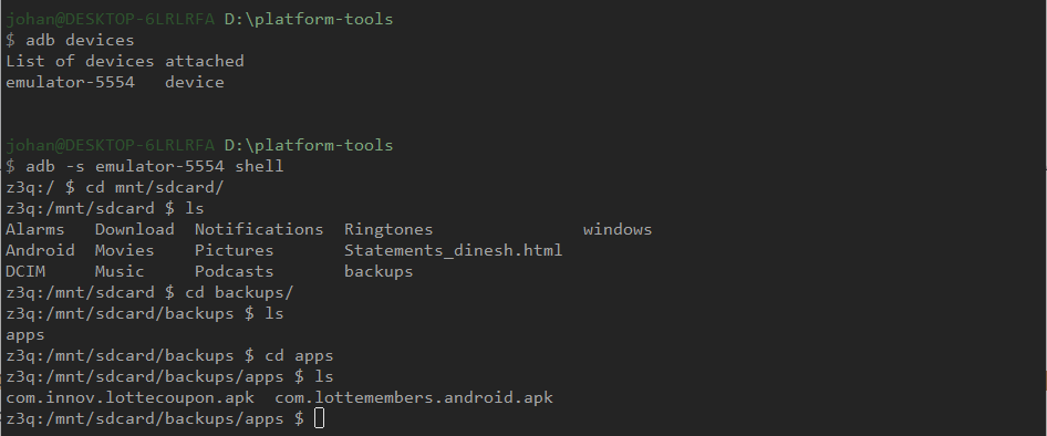 4. adb 쉘에 접속한 후, /mnt/sdcard/ 경로에 backups 폴더에서 백업된 apk 파일을 볼 수 있다. 해당 apk 파일을 호스트 PC 내 복사한다.