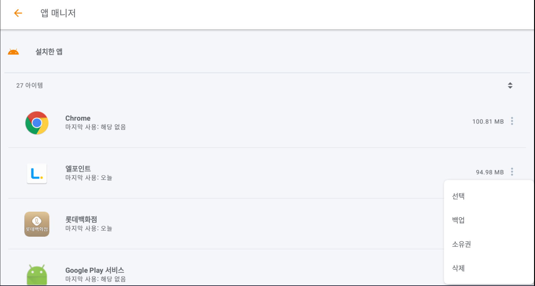 3. [앱 매니저]에서 백업하고자 하는 앱에서 우측의 메뉴에서 백업을 선택해서 백업한다.