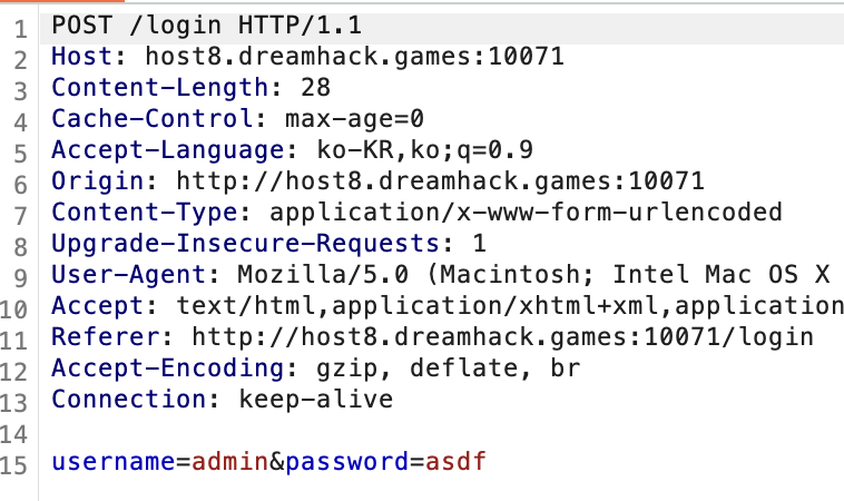 POST 요청에서 username, password 파라미터에서 값을 가져오고, users에 있는 사용자이면 사용자 입력의 password가 원래 pw와 동일한지 확인함. 이때 users에는 guest, admin만 있으며, admin의 pw는 FLAG 값임.