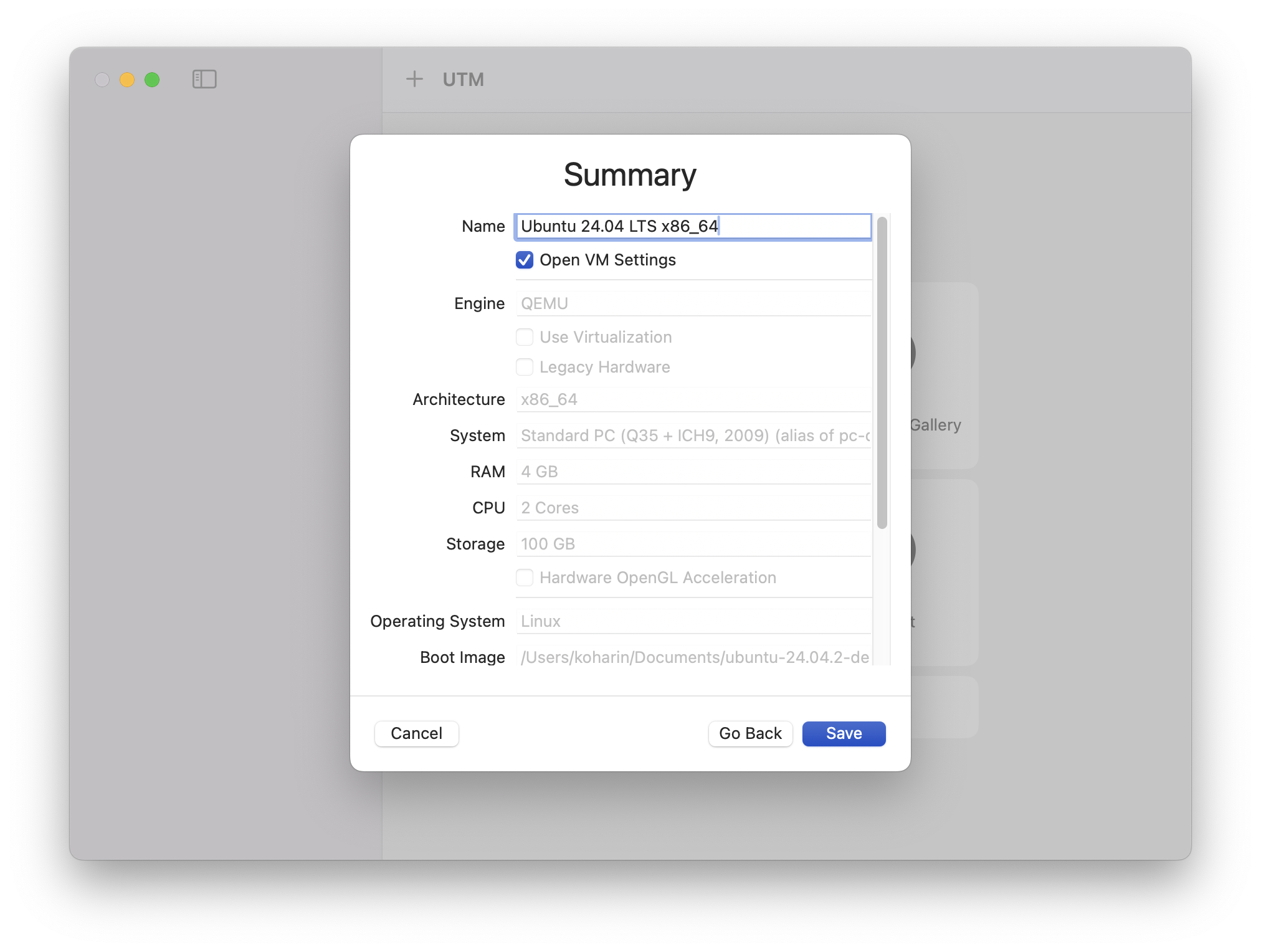 이름만 설정하면 설정이 다 되고, Open VM Settings를 체크하면 세부 QEMU arguments나 display, network 등을 확인할 수 있다.